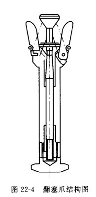 翻塞机的翻塞动作主要由翻塞爪完成,其外形结构如图22—4所示。由输送带输入的输液瓶进入能使瓶体自动定心的定位套,翻塞爪受平面凸轮规律性回转运动的作用而完成将橡胶塞翻口的动作。由于输液瓶能够自动定心,翻塞动作完成的成功率大大提高,瓶子的质量要求也可相应降低。翻塞机的生产能力可在1200—3600瓶/h间任意调节,且当输送带上出现故障时,能够自动停车。